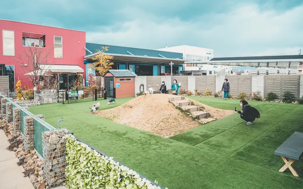 囲いの壁がカッコよくって、綺麗な人工芝だし、丘もあって休憩スペースもある。うん、これだけのクオリティはさすがエクステリアが作るドッグランだわ。本気で作ってる感あります。