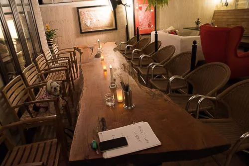 こちらがそのテラス♪ヒーターも完備してあって、左側のテーブル席がワンコOK。右側のソファ席はワンコNGとなってます。