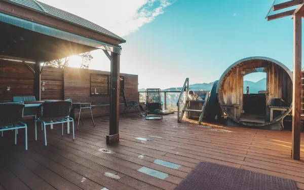 デッキにはバレルサウナ、水風呂、焚火スペース、食事スペースがあって~