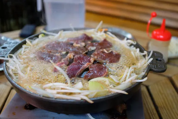 ジンギスカン鍋の溝に水・タレを入れて野菜を投入、中央にお肉をいれてジューーー!