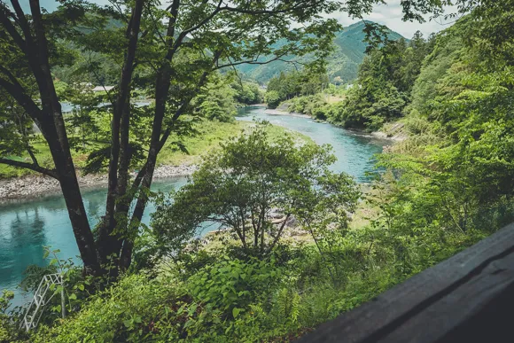すぐ脇には根尾川が流れてる。エメラルドグリーン色だ、めっちゃ綺麗っ!