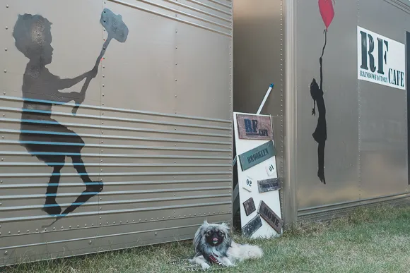 バンクシーっぽいこんなグラフィティーアートがワンコOKテラスに描かれてるんだ。