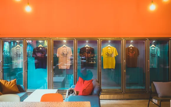 後ろのディスプレイされてるTシャツがめちゃカッコいい。アメリカのスポーツバーみたいだぜ。